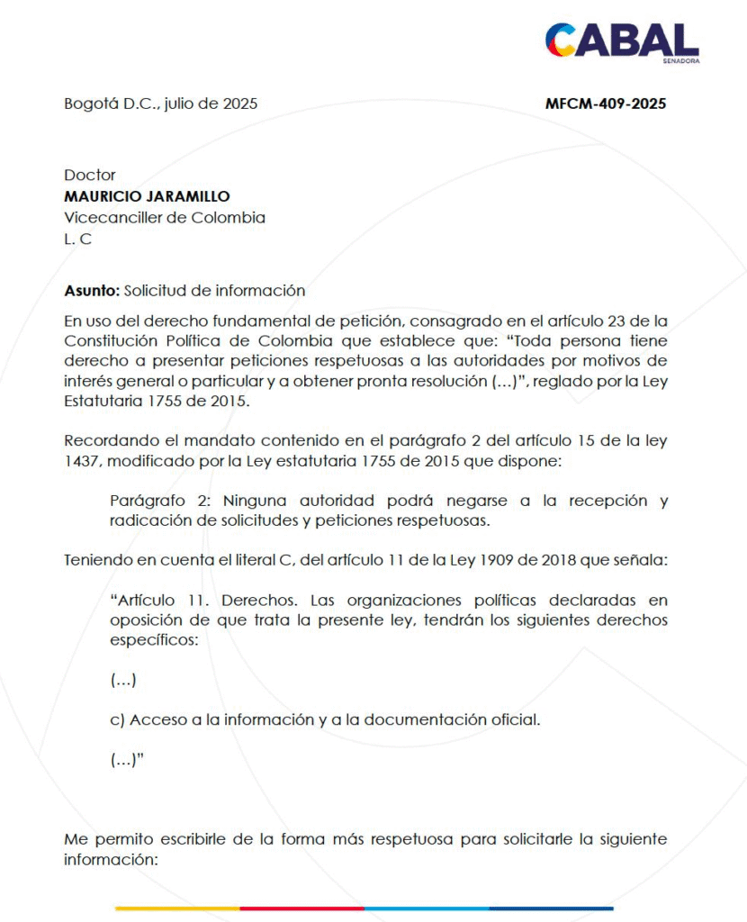La senadora y precandidata presidencial María Fernanda Cabal presentó un derecho de petición al Ministerio de Relaciones Exteriores, solicitando explicaciones claras sobre el futuro de la expedición de pasaportes, luego de que finalizara el contrato con la empresa Thomas Greg & Sons.