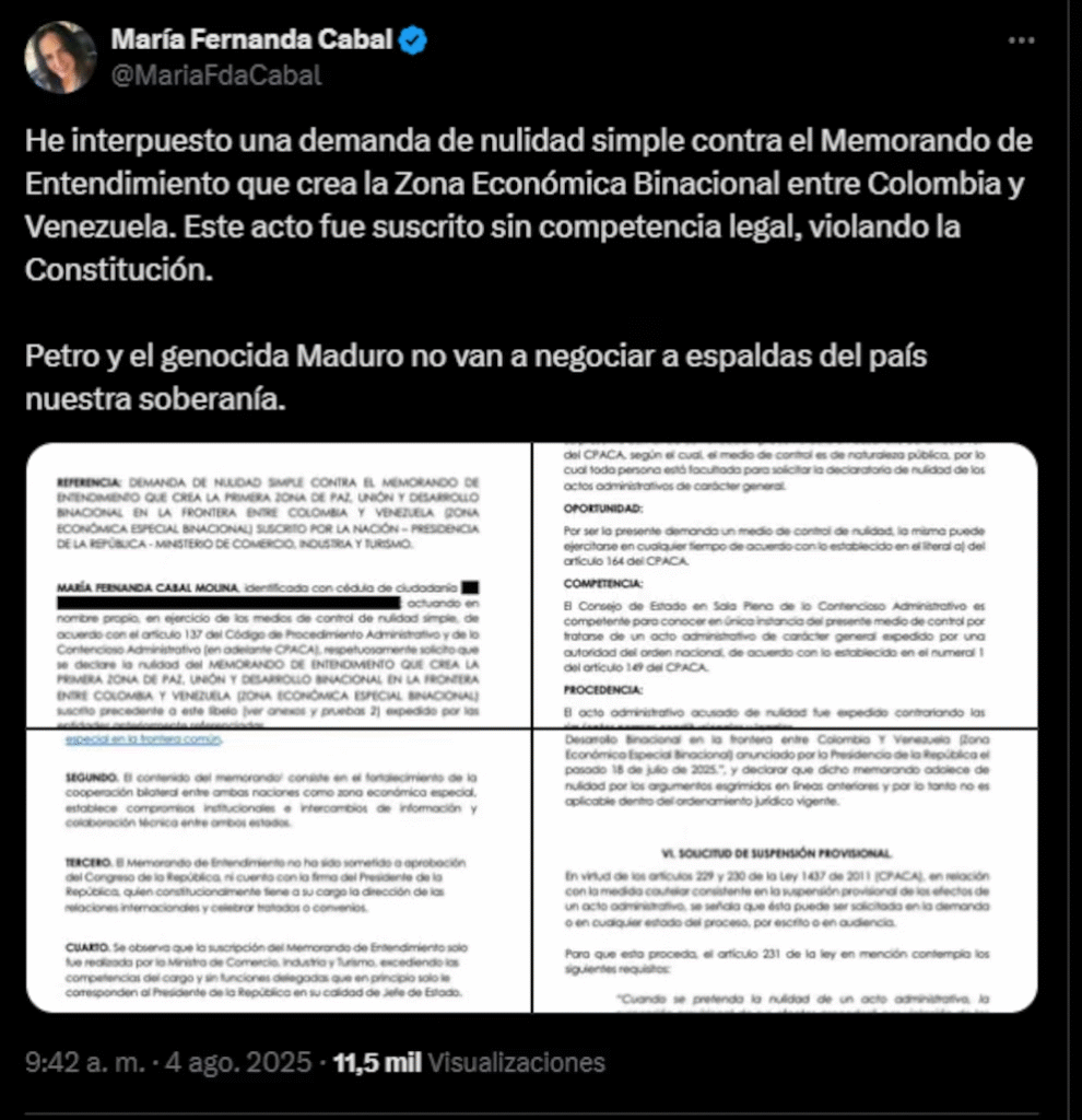 Y, además la precandidata presidencial aseguró que el acuerdo se suscribió sin el sustento legal correspondiente. Adicionalmente, calificó la zona binacional como un intento entre el presidente Petro y líder del régimen venezolano, Nicolás Maduro, de negociar la soberanía del país a espaldas de los colombianos. “Petro y el genocida Maduro no van a negociar a espaldas del país nuestra soberanía“, escribió la congresista en su mensaje.