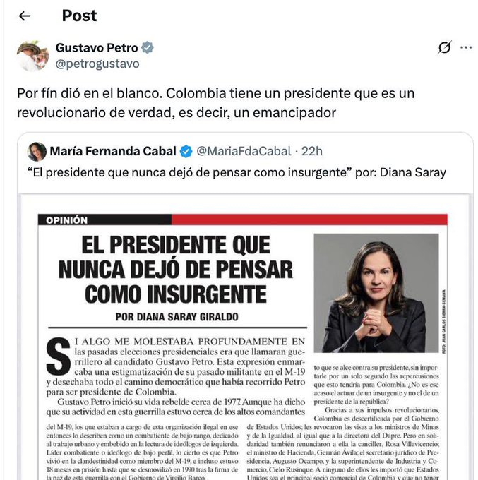 La afirmación de Petro fue una reacción directa a la columna de la periodista Diana Saray Giraldo, difundida por Cabal. En el texto, publicado por la revista Semana, la autora sostiene que el jefe de Estado nunca ha dejado atrás su pensamiento insurgente ni ha asumido del todo el rol institucional que implica su cargo.