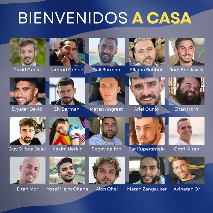Hoy el mundo que ama la libertad celebra porque volvieron a a libertad, después de 738 días secuestrados por Hamas, los últimos 20 rehenes vivos: Eitan Mor, Matan Angrest, Alon Ohel, Gali Berman, Ziv Berman Omri Miran, Guy Gilboa-Dalal, Matan Zangauker, Maxim Herkin, Segev Kalfon, Yosef-Chaim Ohana, Nimrod Cohen, Avinatan Or, Evyatar David, Eitan Horn, David Cunio, Ariel Cunio, Bar Kupershtein, Rom Braslavsk y el colombo israelí Elkana Bohbot. Y el mundo también dice gracias presidente Donald Trump.
