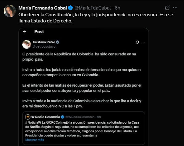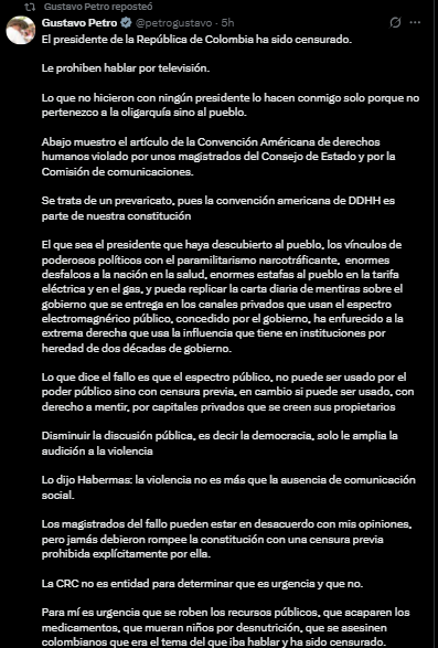 “El presidente de la República de Colombia ha sido censurado en su propio país”, afirmó el mandatario a través de sus redes sociales, tras conocerse el fallo de la entidad reguladora. En respuesta, anunció que tomará acciones judiciales e hizo un llamado a juristas nacionales e internacionales para acompañar una defensa contra lo que considera una restricción ilegítima de su derecho a dirigirse al país.