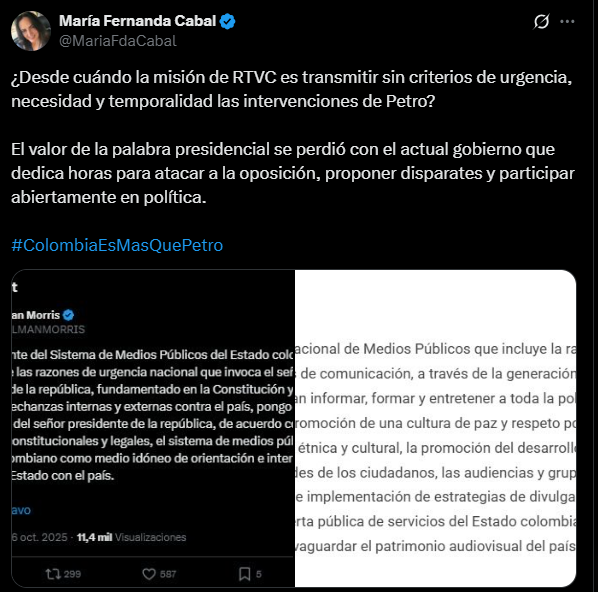 “¿Desde cuándo la misión de RTVC es transmitir sin criterios de urgencia, necesidad y temporalidad las intervenciones de Petro?”, escribió, asegurando que el valor de la palabra presidencial “se perdió con el actual gobierno que dedica horas para atacar a la oposición, proponer disparates y participar abiertamente en política”.