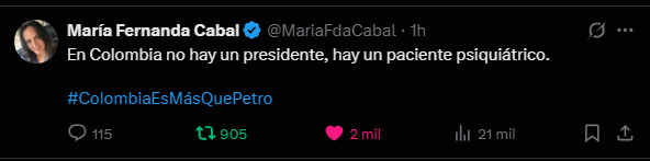 Y en otro trino en X la precandidata presidencial afirma: “En Colombia no hay un presidente, hay un paciente psiquiátrico”.