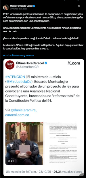 “Petro, acorralado por los escándalos, la corrupción en su gobierno y los señalamientos por vínculos con el narcotráfico, ahora pretende engañar a los colombianos con una Constituyente. Una Asamblea Nacional Constituyente no soluciona ningún problema real del país, ¡pero sí abre la puerta a un golpe de Estado disfrazado de legalidad! Le diremos NO en el Congreso de la República. Aquí no hay que cambiar la Constitución, hay que cambiar a Petro.”
