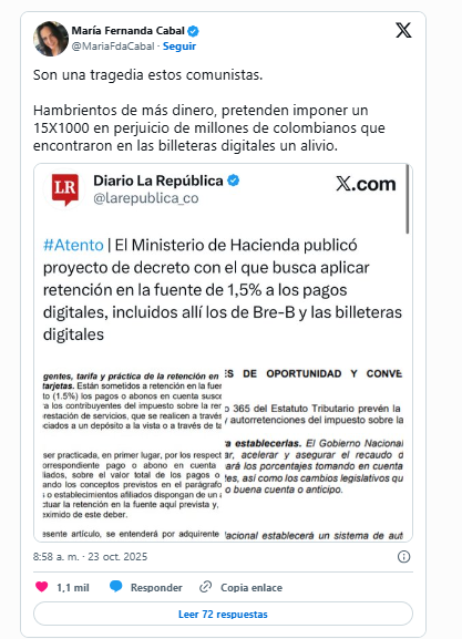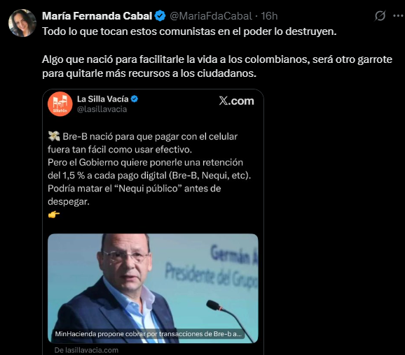 “Son una tragedia estos comunistas. Hambrientos de más dinero, pretenden imponer un 15X1000 en perjuicio de millones de colombianos que encontraron en las billeteras digitales un alivio”, escribió Cabal.