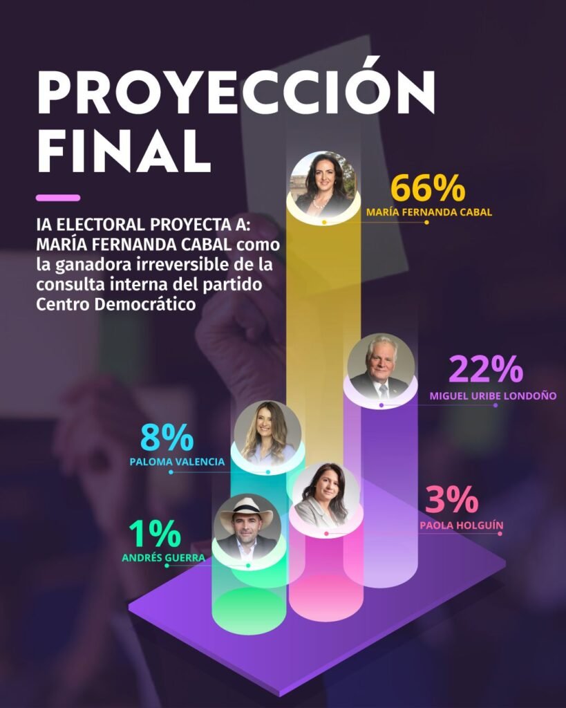 Según el más reciente análisis de IA Electoral, la senadora María Fernanda Cabal se perfila como la ganadora irreversible de la consulta interna del Centro Democrático, con una proyección del 66 % de apoyo, cifra que la ubica muy por encima de sus contendores.