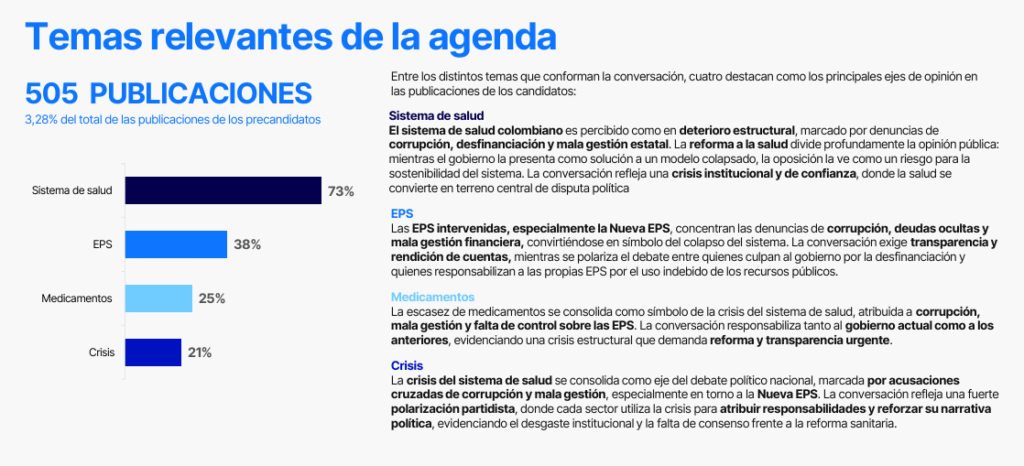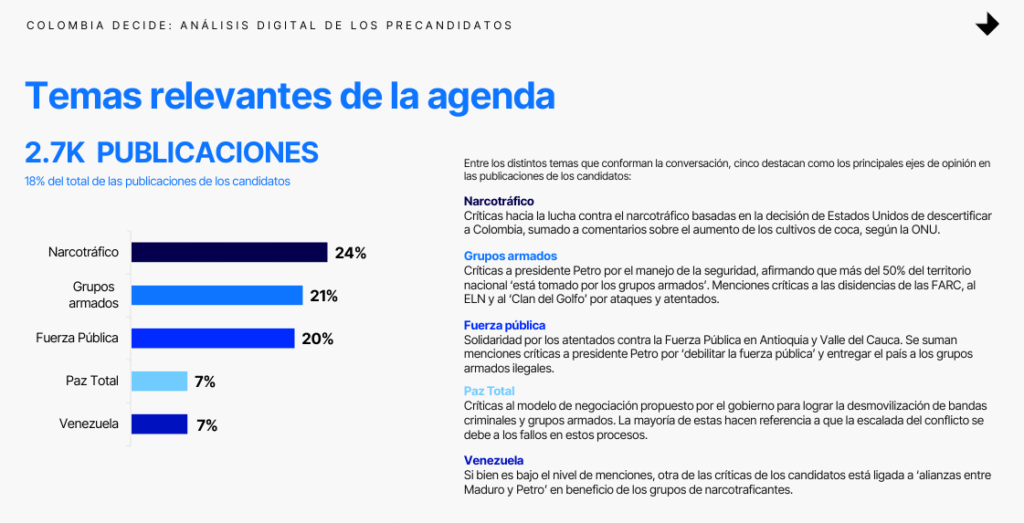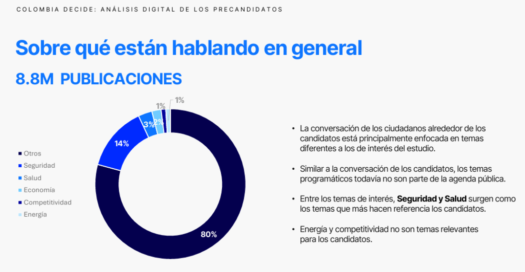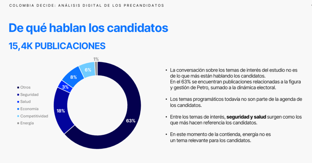 Según Edelman, el 63 % de las publicaciones analizadas se centran en la figura y gestión del presidente Gustavo Petro, además de la dinámica electoral, mientras los temas programáticos apenas figuran en la agenda de los precandidatos.