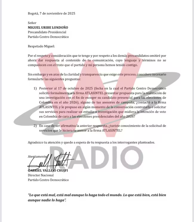 “Posterior al 17 de octubre de 2025 (fecha en la cual el Partido Centro Democrático solicitó formalmente a la firma ATLASINTEL presentar propuesta para la realización de una investigación con el fin de escoger su candidato presidencial para las elecciones de Colombia en el año 2026), alguno de tus asesores de campaña, ¿contactó a la firma ATLASINTEL y le propuso en algún momento de la conversación contratarla o solicitar sus servicios para realizar un estudio o investigación que midiera la intención de voto en Colombia de cara a las elecciones presidenciales del año 2026?, planteó Vallejo.