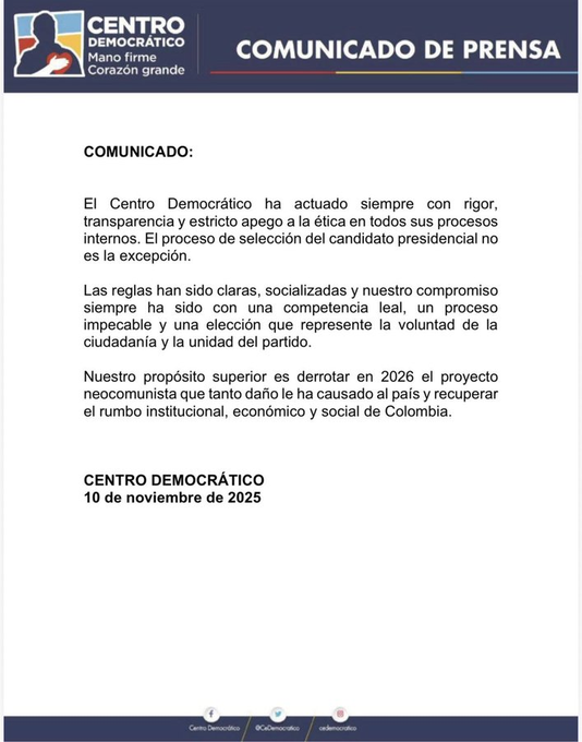 Mientras tanto, el Centro Democrático insiste en que ha actuado con transparencia y ética en la organización del proceso. Sin embargo, la crisis desatada deja ver un panorama incierto para el partido que lidera Álvaro Uribe Vélez, justo cuando debería estar consolidando su unidad de cara a las elecciones de 2026.