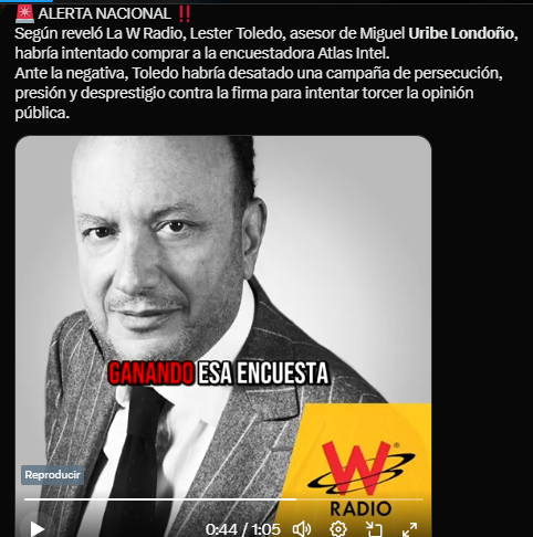 Además, según fuentes cercanas al proceso, la salida de AtlasIntel se habría precipitado, tras un acercamiento de miembros de la campaña del precandidato Miguel Uribe Londoño a la encuestadora. Un tema que pone en la mira y cuestiona la ética de Uribe Londoño y su equipo de campaña, del cual es parte Lester Toledo, quien también se supo asesora al precandidato Juan Carlos Pinzón.