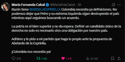 “Razón tiene @ABDELAESPRIELLA. Colombia necesita ya definiciones. No podemos dejar que Petro y su extrema izquierda sigan destruyendo el país mientras aquí seguimos buscando un acuerdo.