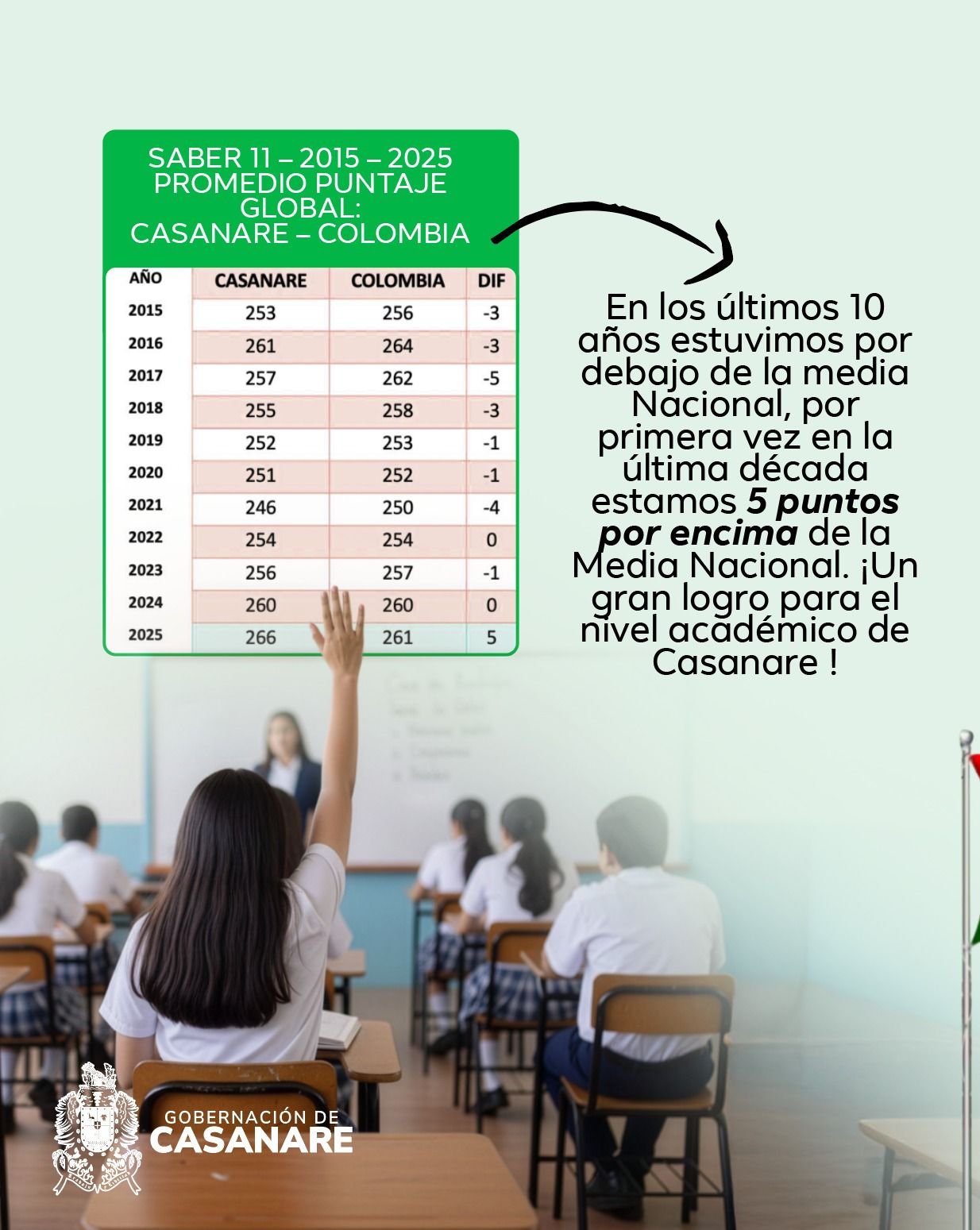 2.-En los últimos 10 años estuvimos por debajo de la media Nacional, por primera vez de la última década estamos 5 puntos por encima de la Media Nacional. ¡Un gran logro para el nivel académico de Casanare!