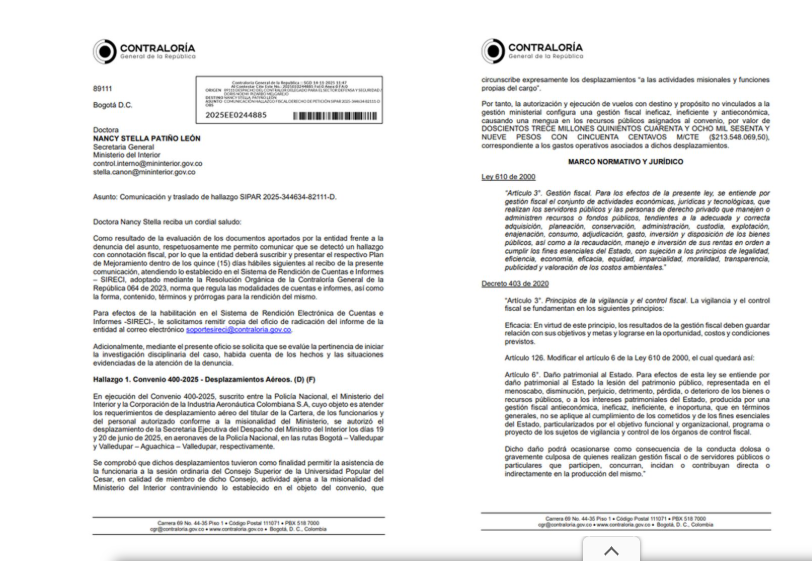 Según la entidad, entre el 19 y el 21 de junio de 2025 se realizaron cinco vuelos oficiales que terminaron generando un hallazgo fiscal por $213.548.069, valor correspondiente al costo total de los desplazamientos, vuelos que tenían como pasajeros a Juliana Guerrero, Verónica Guerrero y Ricardo Adolfo Suárez.