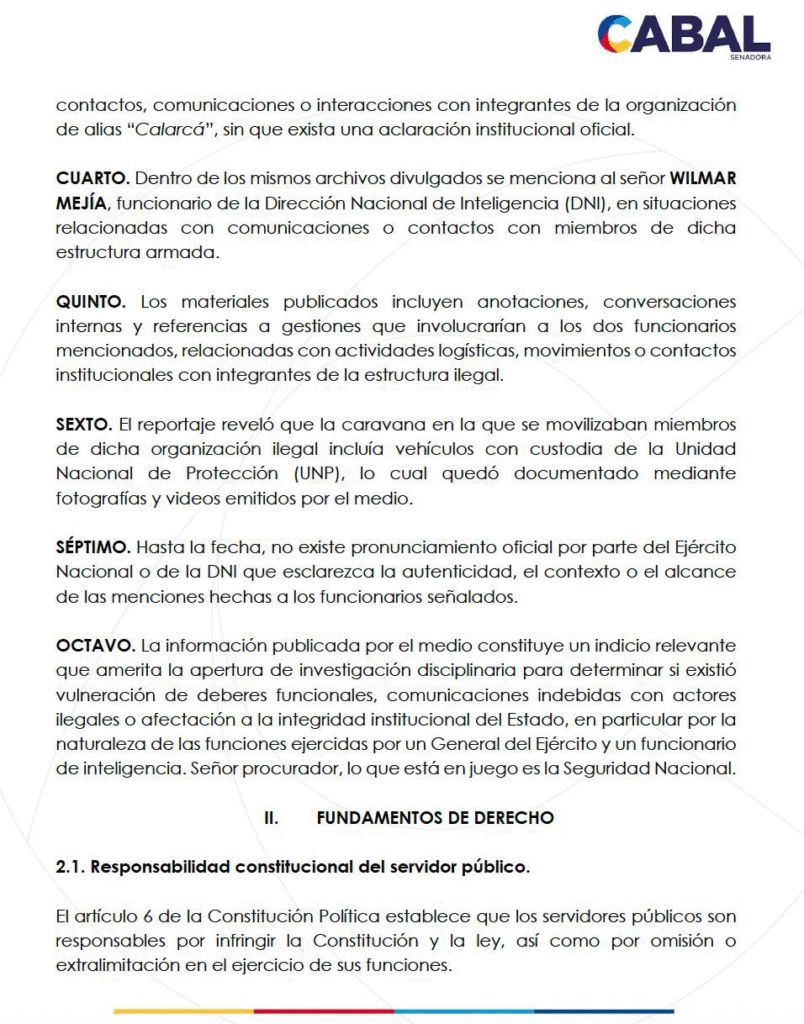 La senadora y precandidata presidencial María Fernanda Cabal radicó una queja formal ante la Procuraduría General de la Nación tras las revelaciones de Noticias Caracol que mencionan al general del Ejército Juan Miguel Huertas y a Wilmar Mejía, funcionario de la Dirección Nacional de Inteligencia (DNI), en presuntos contactos con alias Calarcá, señalado cabecilla de las disidencias de las FARC.