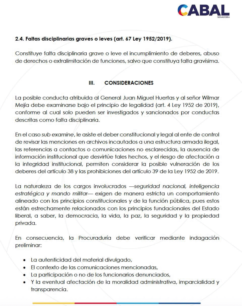 En su denuncia dirigida al procurador Gregorio Eljach, la senadora pidió medidas de suspensión provisional contra Huertas y Mejía mientras avanzan las verificaciones, así como la recolección urgente de pruebas para proteger la integridad del Ejército y de la DNI. El documento incluye un recuento de los hechos divulgados por la prensa, las normas disciplinarias presuntamente vulneradas y solicitudes concretas a las entidades involucradas.