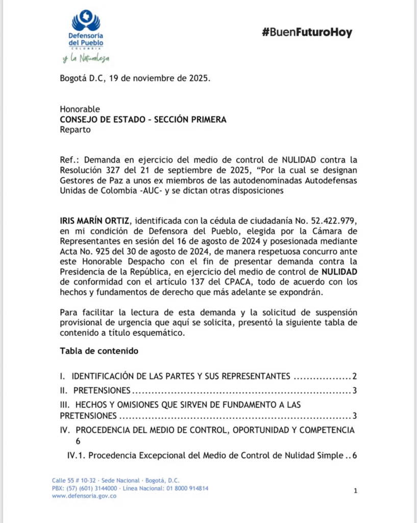 El documento presentado por la Defensoría, de 56 páginas y firmado por Iris Marín Ortiz, actual titular de la entidad, fue remitido al alto tribunal con el objetivo de que se declare la nulidad de la resolución 327 del 21 de septiembre de 2025.