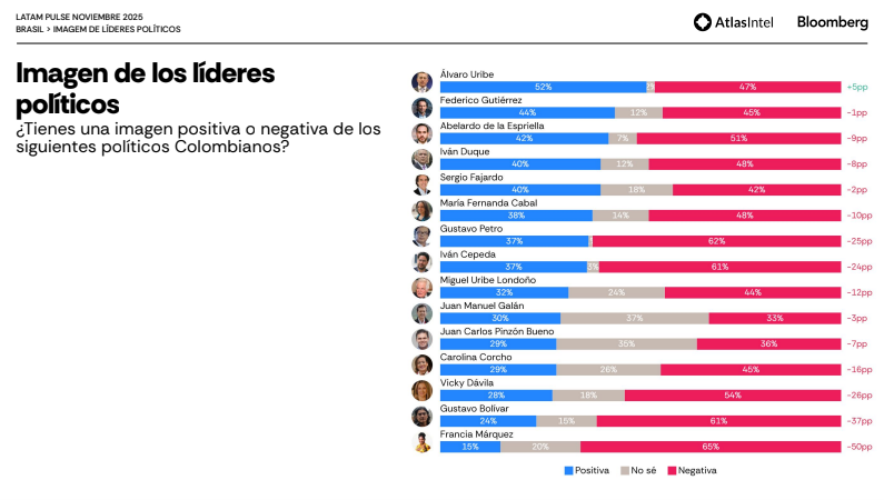 El estudio evalúa la imagen de figuras clave de la política colombiana, mostrando un patrón común: predomina la opinión negativa, aunque en distintos niveles.