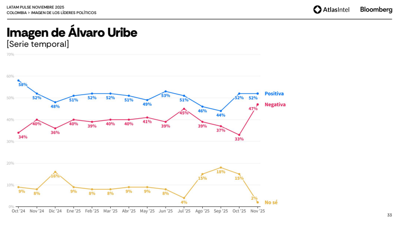 Aunque todavía no es candidata oficial, María Fernanda Cabal apareció en la más reciente medición de AtlasIntel & Bloomberg – Latam Pulse, Colombia (noviembre 2025), una de las encuestadoras consideradas entre las más precisas de América y que suele ofrecer una fotografía detallada del panorama político colombiano. En su análisis, la firma incluyó a Cabal dentro de un grupo selecto de líderes nacionales, compuesto en su mayoría por expresidentes y figuras de alto reconocimiento.