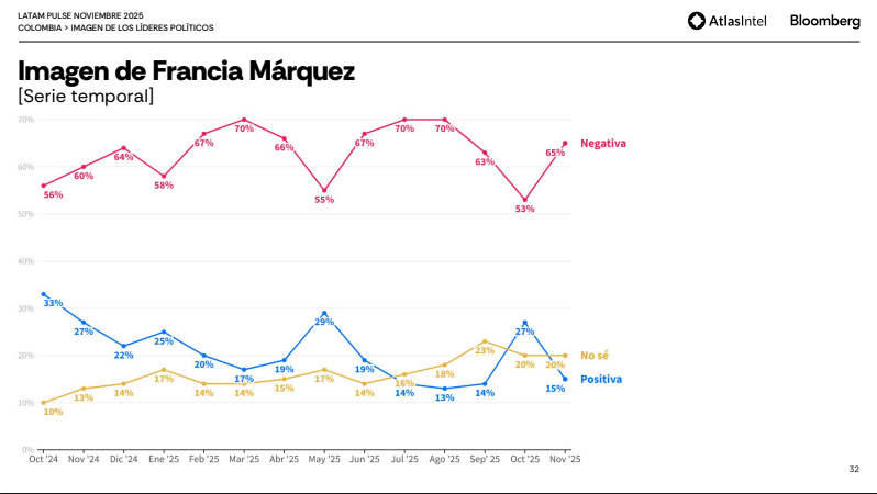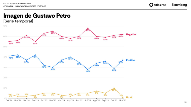 Además la medición Latam Pulse de AtlasIntel y Bloomberg deja en evidencia la imagen negativa del actual gobierno de Gustavo Petro y los retos que debe enfrentar el nuevo presidente electo en el 2026, como por ejemplo la caída de confianza económica, entre otros: