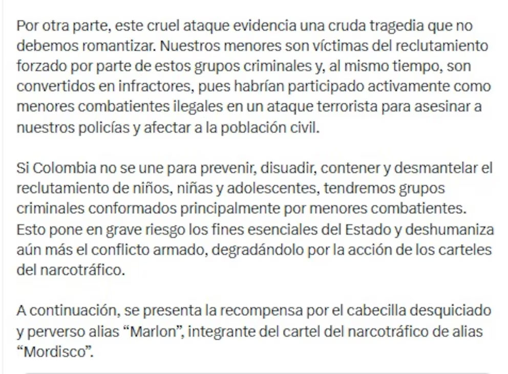 A este panorama se suma una denuncia aún más grave: la participación de menores de edad en el ataque. El ministro de Defensa confirmó que niños y adolescentes reclutados de manera forzada habrían actuado como combatientes, dejando ocho policías heridos y varias viviendas destruidas en el Cauca.