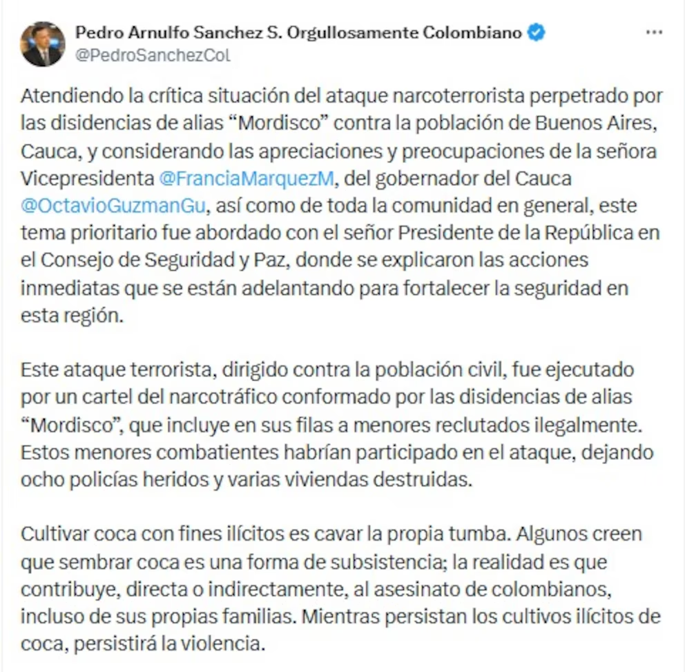 La toma de Buenos Aires no fue un hecho aislado. Mientras el Cauca ardía, en Cali dos policías fueron asesinados por el ELN en un ataque con explosivos, evidenciando una escalada simultánea de violencia en el suroccidente del país.