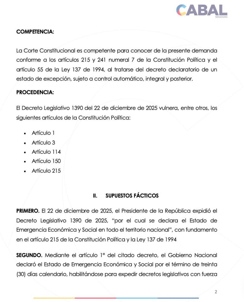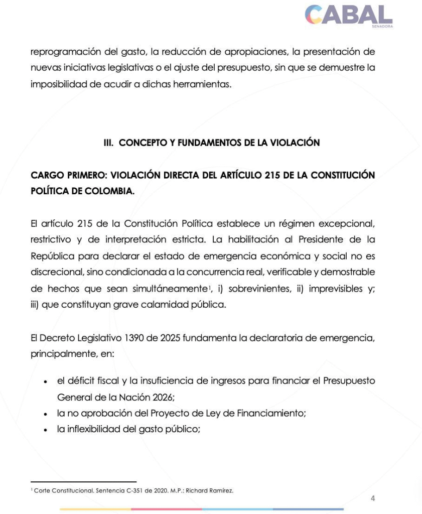 A través de sus redes sociales, Cabal confirmó la radicación de la demanda y explicó que la declaratoria de emergencia no se apoya en hechos sobrevinientes ni imprevisibles, como lo exige el artículo 215 de la Carta Política. Por el contrario, sostiene que el Ejecutivo fundamentó la medida en problemas fiscales ampliamente conocidos dentro del ciclo presupuestal.