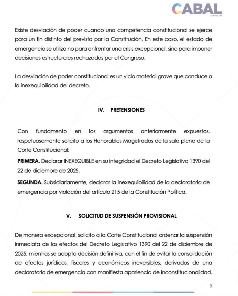 “La emergencia económica no puede usarse para corregir errores de planeación ni para suplir la falta de respaldo político en el Congreso. Ninguno de los argumentos del Gobierno cumple el estándar de hechos imprevisibles que exige la Constitución”, advierte la demanda.