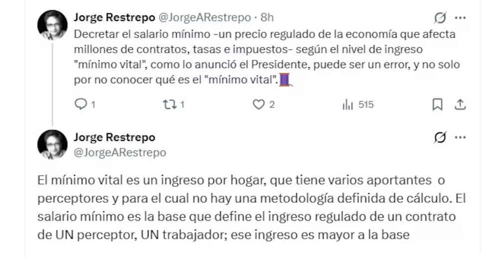 La iniciativa, sin embargo, ha generado reparos entre algunos expertos. El economista Jorge Restrepo, profesor de la Universidad Javeriana, advirtió que fijar el salario mínimo con base en el concepto de “mínimo vital podría ser un error“. A través de la red social X, señaló que el mínimo vital corresponde a un ingreso por hogar, con varios perceptores, y que no existe una metodología clara para su cálculo.