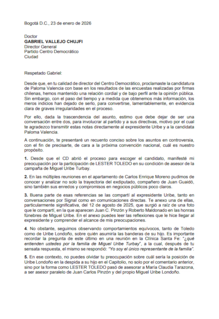 En la carta, Lafaurie también subraya que tanto él como María Fernanda Cabal quedaron políticamente marginados dentro del Centro Democrático tras el proceso interno. “No queremos afectar el proceso interno que seleccionó a Paloma Valencia como su candidata. No queremos anular su aspiración. No queremos continuar en el Centro Democrático”, señala de manera explícita.