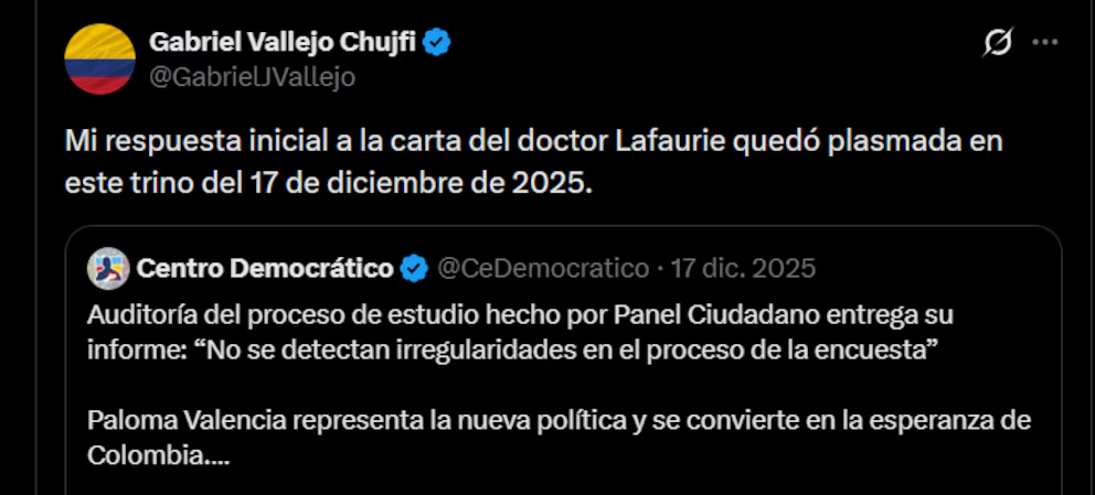 A través de su cuenta de X, Gabriel Vallejo respondió a la carta de José Félix Lafaurie, en la cual citan el documento con la auditoría del proceso que terminó con la elección de Paloma Valencia como candidata presidencial.