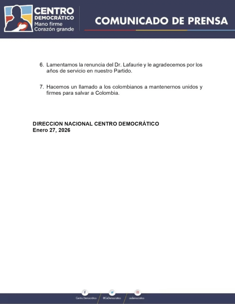 Finalmente, el partido lamentó la renuncia de José Félix Lafaurie y agradeció sus años de militancia, al tiempo que hizo un llamado a la unidad nacional.