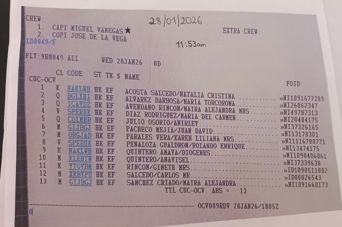 Según el manifiesto inicial, los tripulantes serían el capitán Miguel Vanegas y el copiloto José de la Vega.