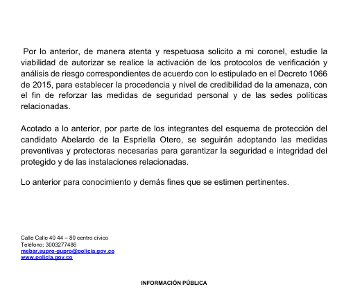 Tras recibir la información, la campaña aseguró que el caso fue remitido de inmediato a las autoridades competentes. El comunicado de prensa señala que la información fue enviada a la Seccional de Protección y Servicios Especiales para activar los protocolos de verificación, evaluación de riesgo y fortalecimiento de las medidas de seguridad.