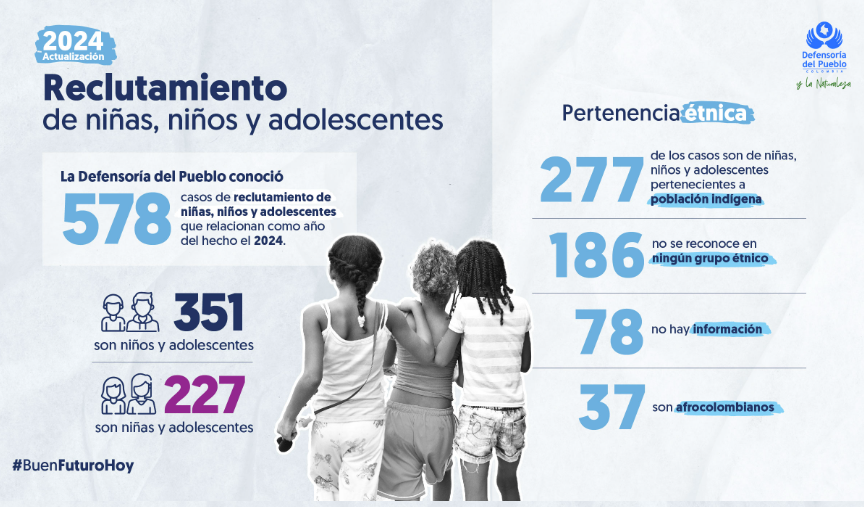 En 2024 se registraron 578 casos de reclutamiento de menores de edad. Más allá de las cifras, el reclutamiento forzado implica la ruptura de proyectos de vida y la exposición a violencia extrema. El Estado y la sociedad tienen la responsabilidad de garantizar entornos seguros y oportunidades para la niñez y adolescencia.