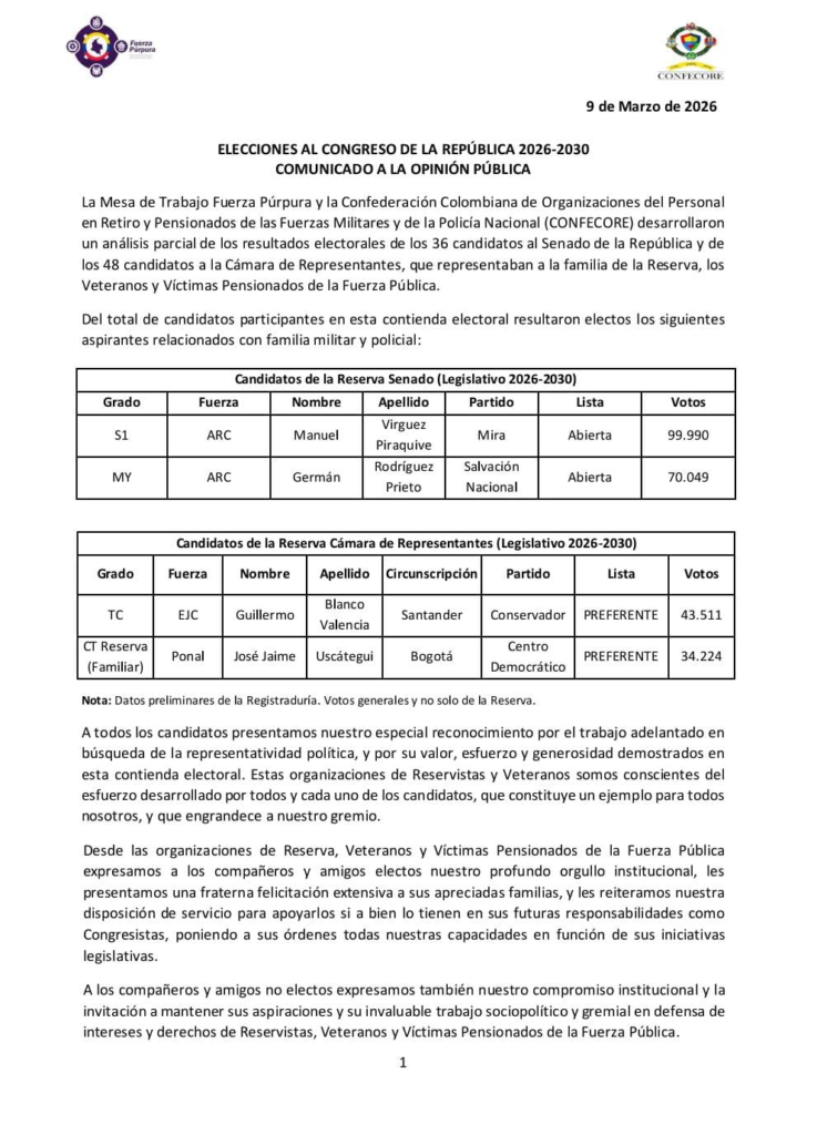 Las recientes elecciones al Congreso de la República para el periodo legislativo 2026-2030 dejaron como resultado la elección de varios representantes vinculados a la familia de la Reserva, los Veteranos y las Víctimas Pensionadas de la Fuerza Pública. Así lo dio a conocer la Mesa de Trabajo Fuerza Púrpura junto con la Confederación Colombiana de Organizaciones del Personal en Retiro y Pensionados de las Fuerzas Militares y de la Policía Nacional (CONFECOR), mediante un comunicado dirigido a la opinión pública.
