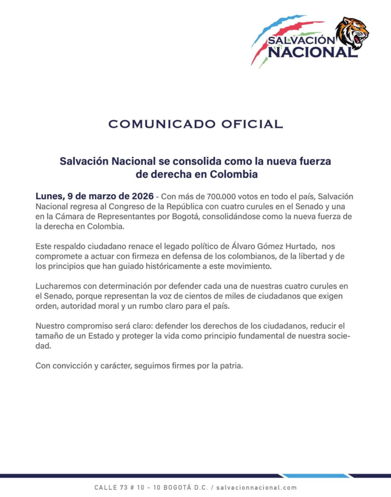 La colectividad aseguró que este resultado representa un respaldo ciudadano significativo y marca su consolidación como una nueva fuerza política de derecha en Colombia. El anuncio fue realizado mediante un comunicado oficial en el que el movimiento destacó la votación alcanzada a nivel nacional.