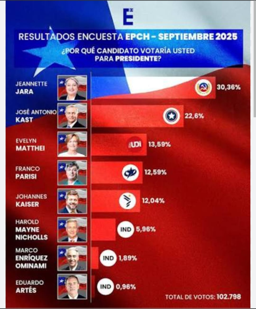 En el caso chileno, la encuesta EPCH de septiembre de 2025 mostraba un escenario altamente fragmentado en primera vuelta. Jeannette Jara lideraba con un 30,36%, seguida por José Antonio Kast con 22,6%. Más atrás aparecían Evelyn Matthei (13,59%), Franco Parisi (12,59%) y Johannes Kaiser (12,04%), configurando un mapa político disperso y competitivo.
