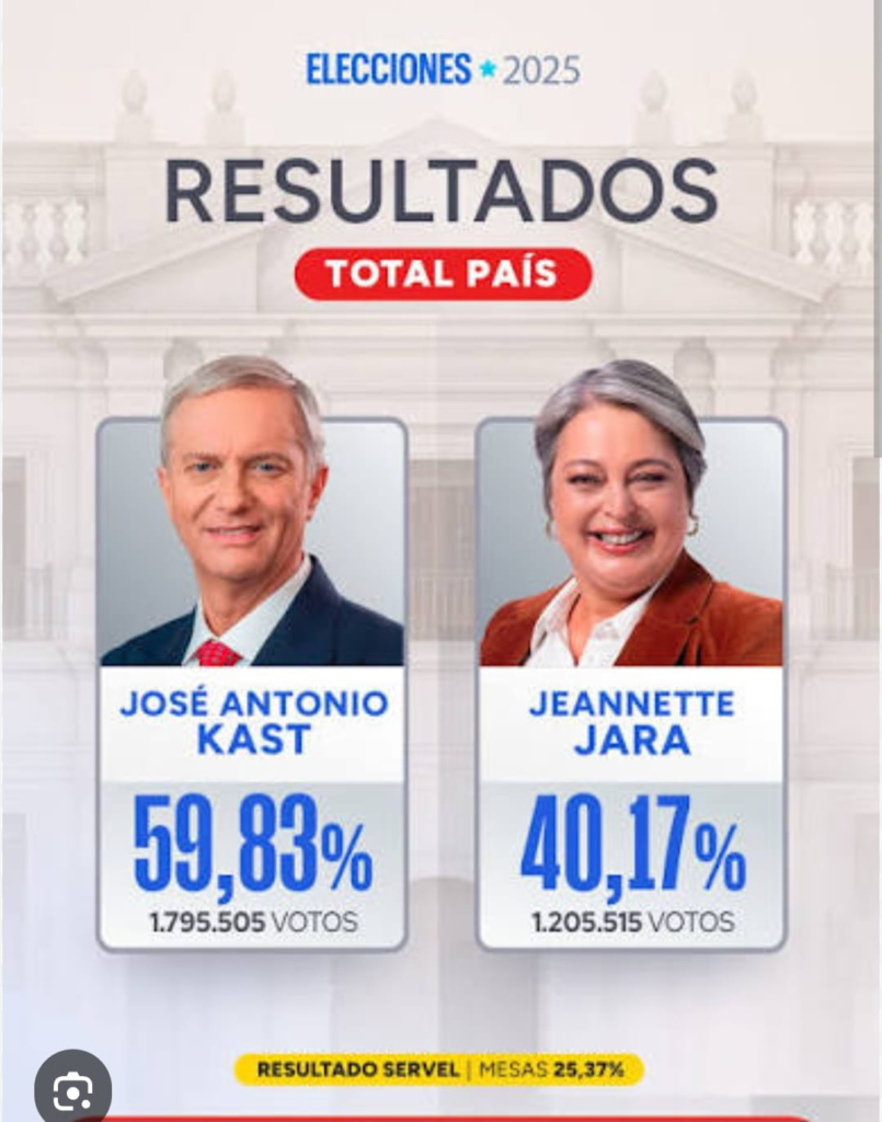 Sin embargo, el paso a segunda vuelta transformó radicalmente el escenario. Según los resultados mostrados, Kast alcanzó un 59,83% frente al 40,17% de Jara. Este salto revela dos fenómenos clave: