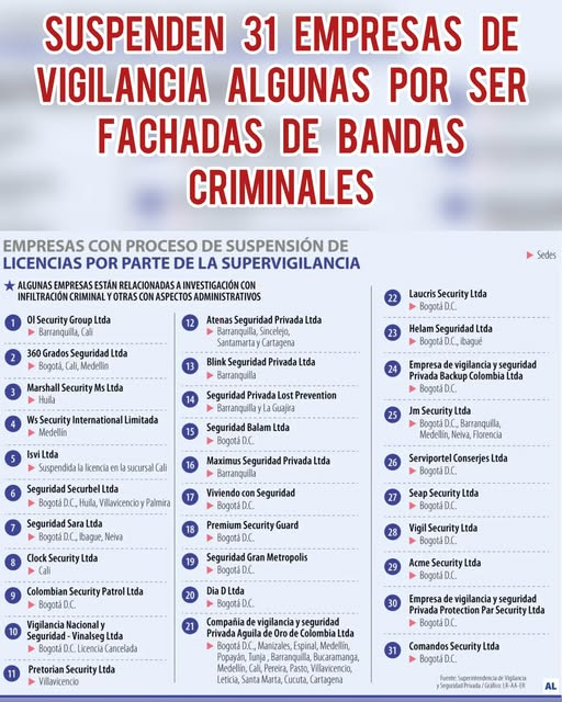 La suspensión de 31 licencias de funcionamiento a empresas de vigilancia y seguridad privada por presunta infiltración de estructuras criminales no solo representa una acción contundente de la Superintendencia del sector, sino que deja al descubierto fallas estructurales en los mecanismos de control y supervisión de una actividad altamente sensible para el país.