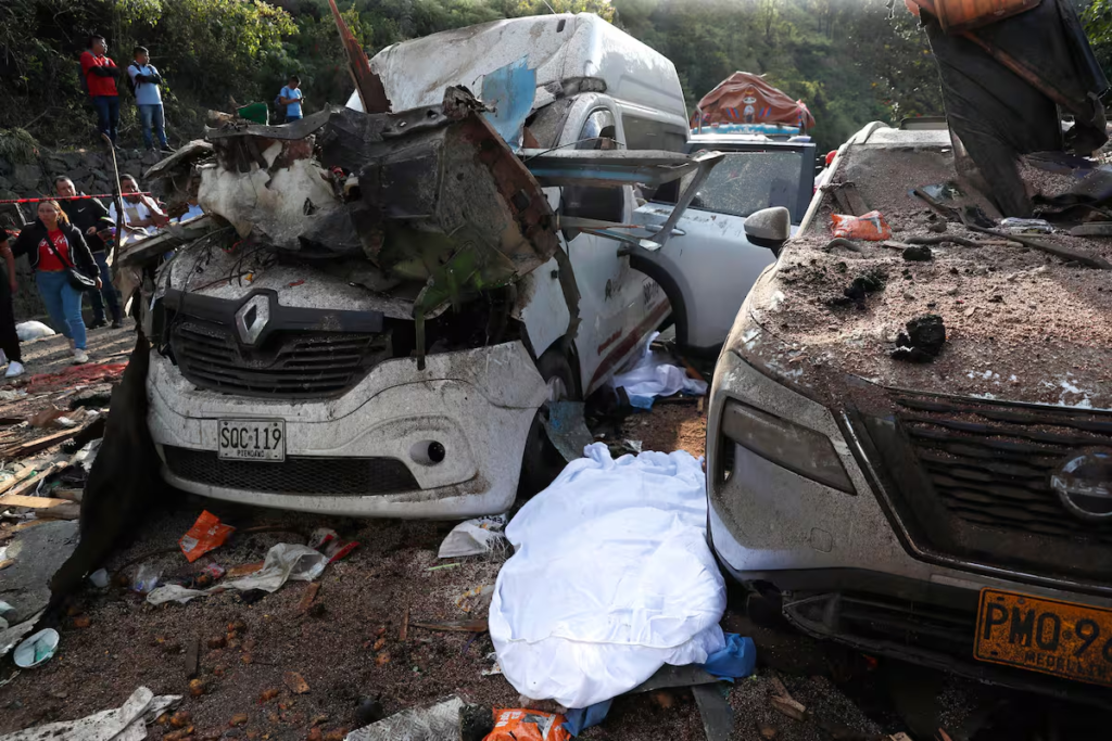 La detonación abrió un cráter de gran magnitud en la carretera y provocó graves daños a varios vehículos, algunos de los cuales terminaron volcados por la fuerza de la onda expansiva. Imágenes posteriores al ataque evidencian automotores detenidos sobre la vía, personas auxiliando a los heridos y la profunda huella dejada por el explosivo.